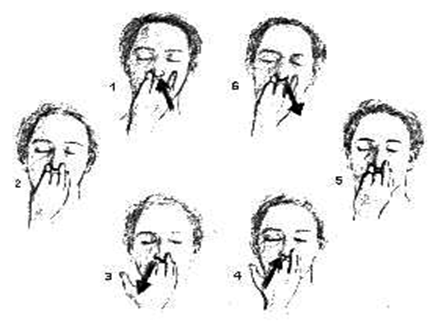 6.По окончании задержки делаем выдох левой ноздрёй, открывая ее безымянным пальцем и мизинцем (это составляет один дыхательный цикл).
